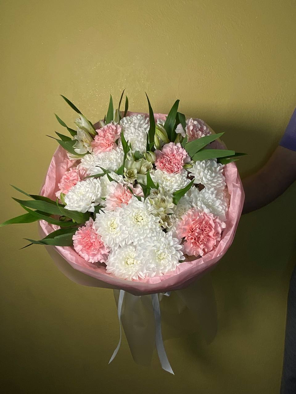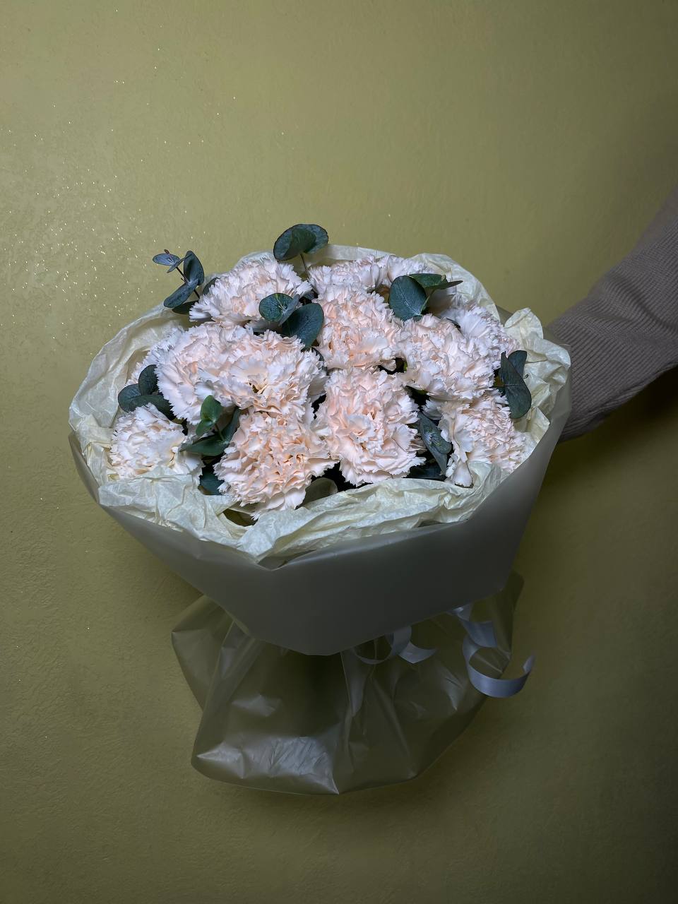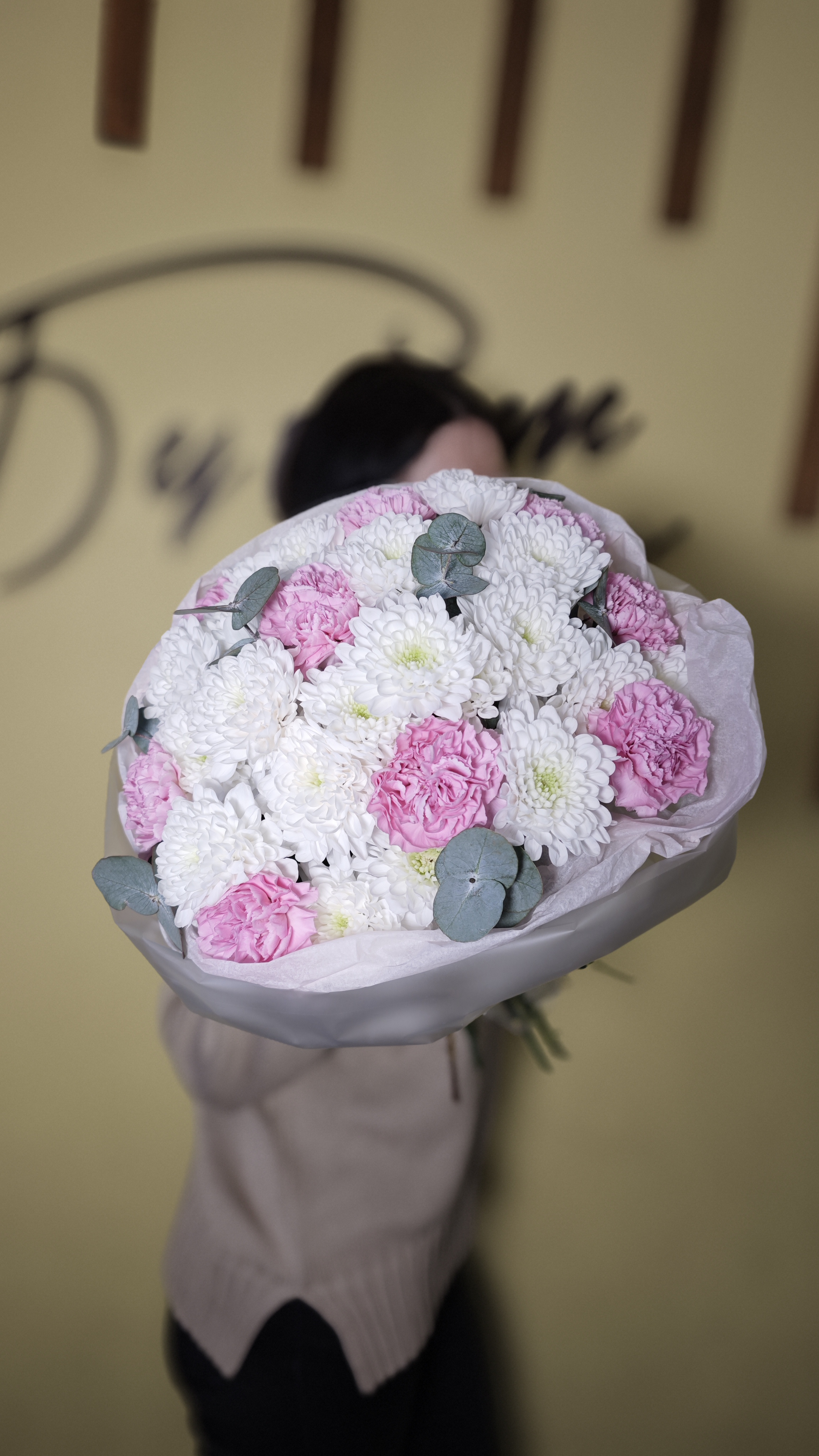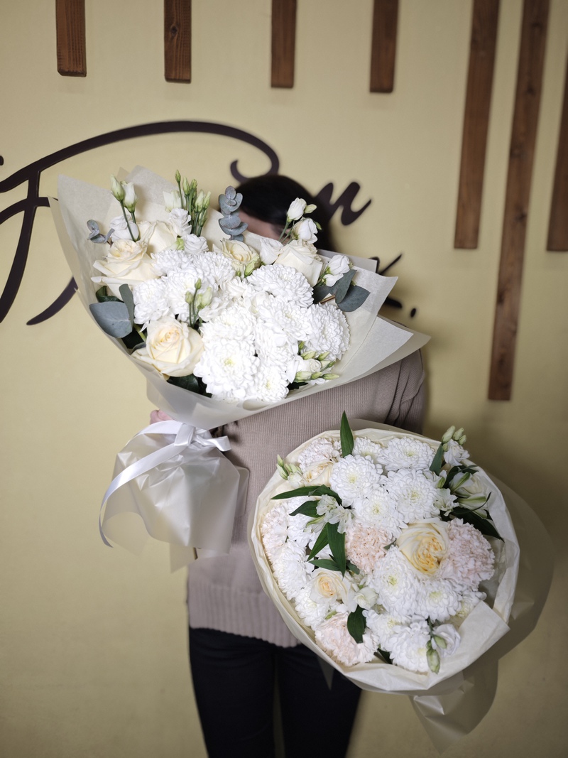 Хризантема Бигуди, кустовая хризантема, эвкалипт, лизиантус, хамелациум.