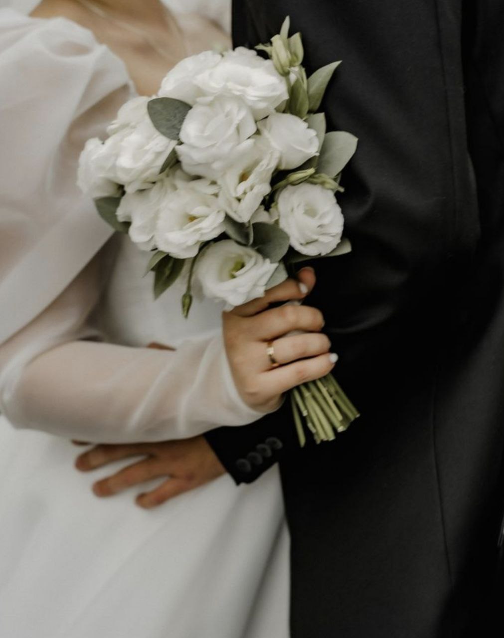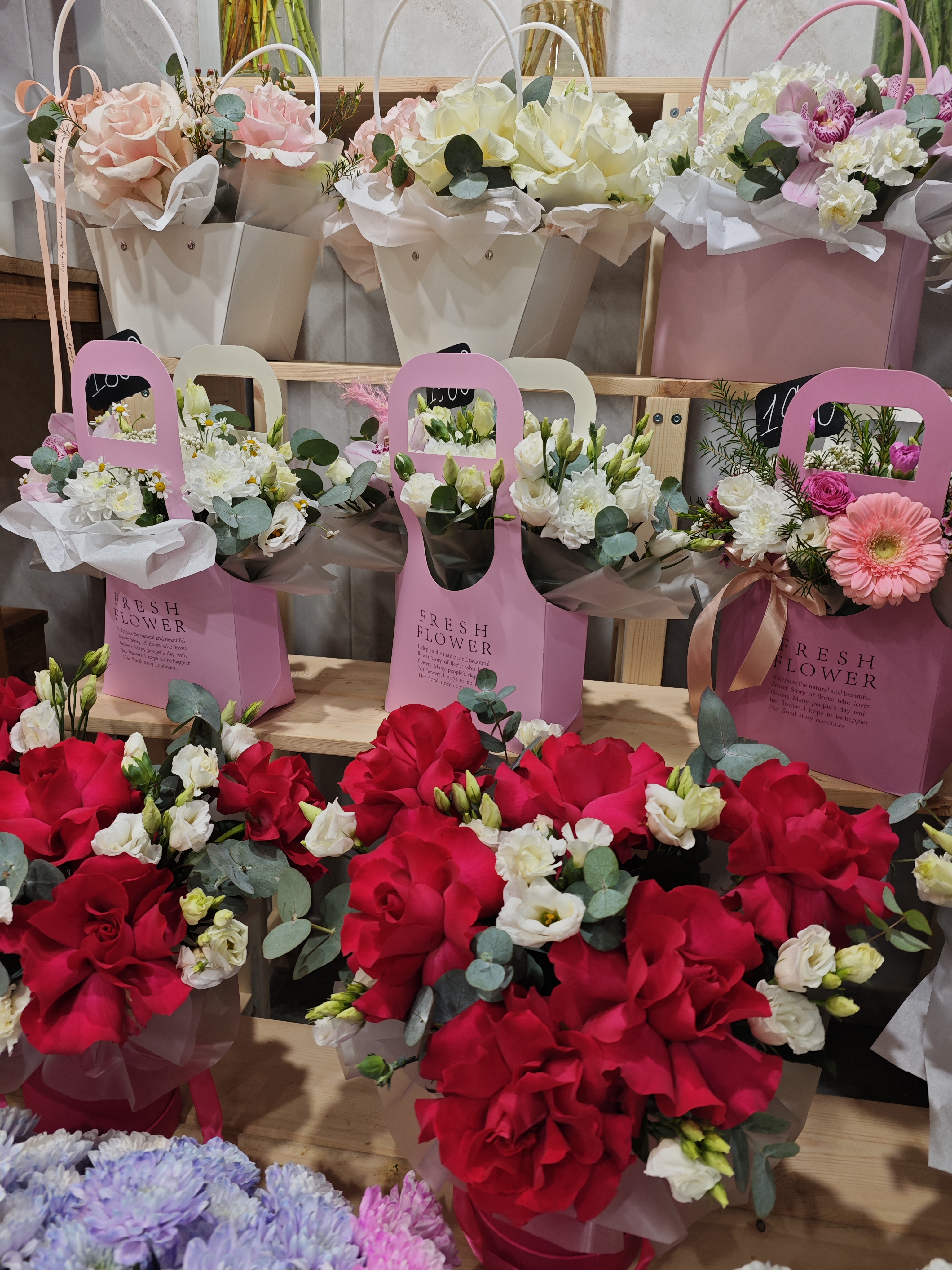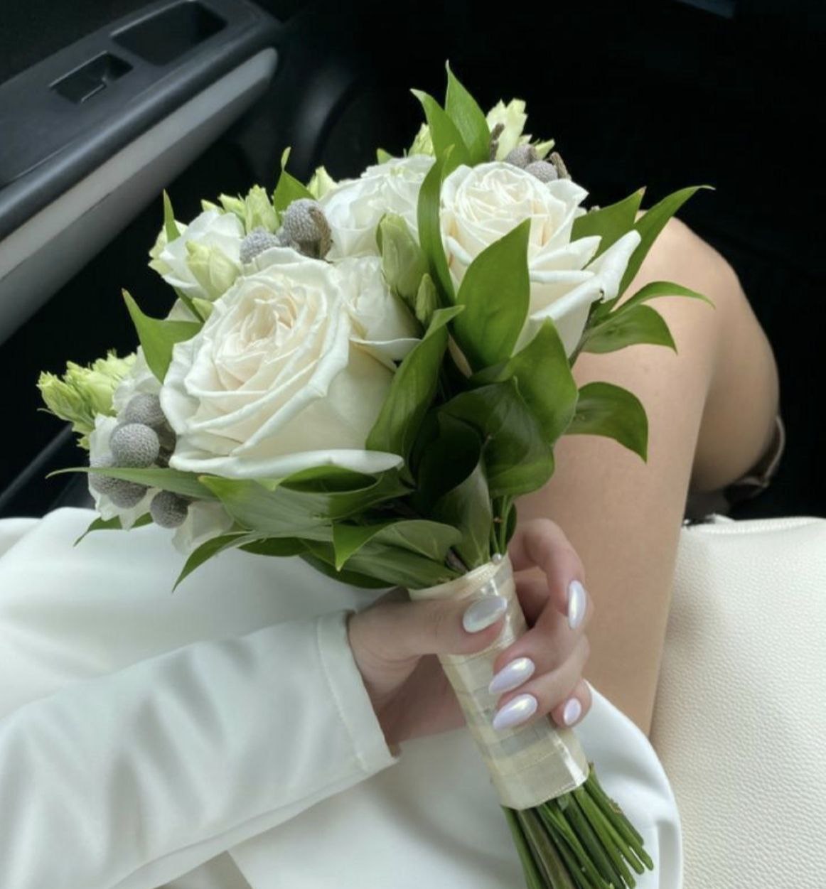 Французская роза, хризантемы, лизиантус, диантус, гиперикум, эвкалипт.