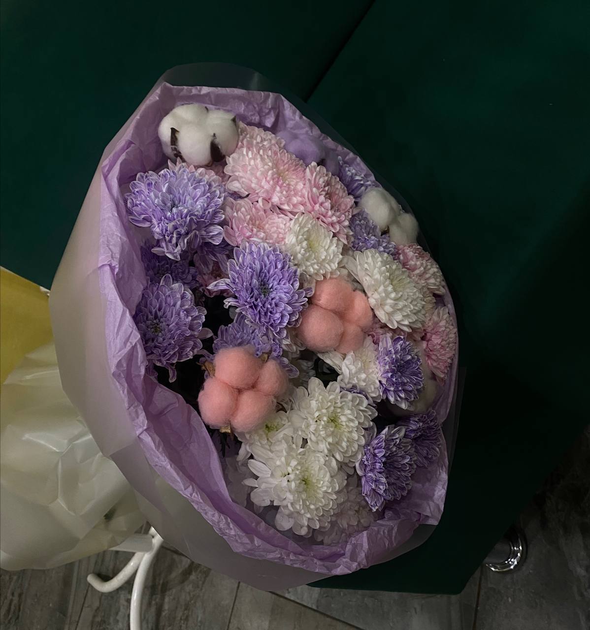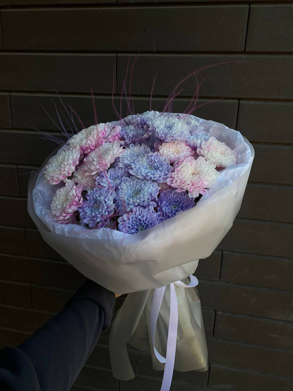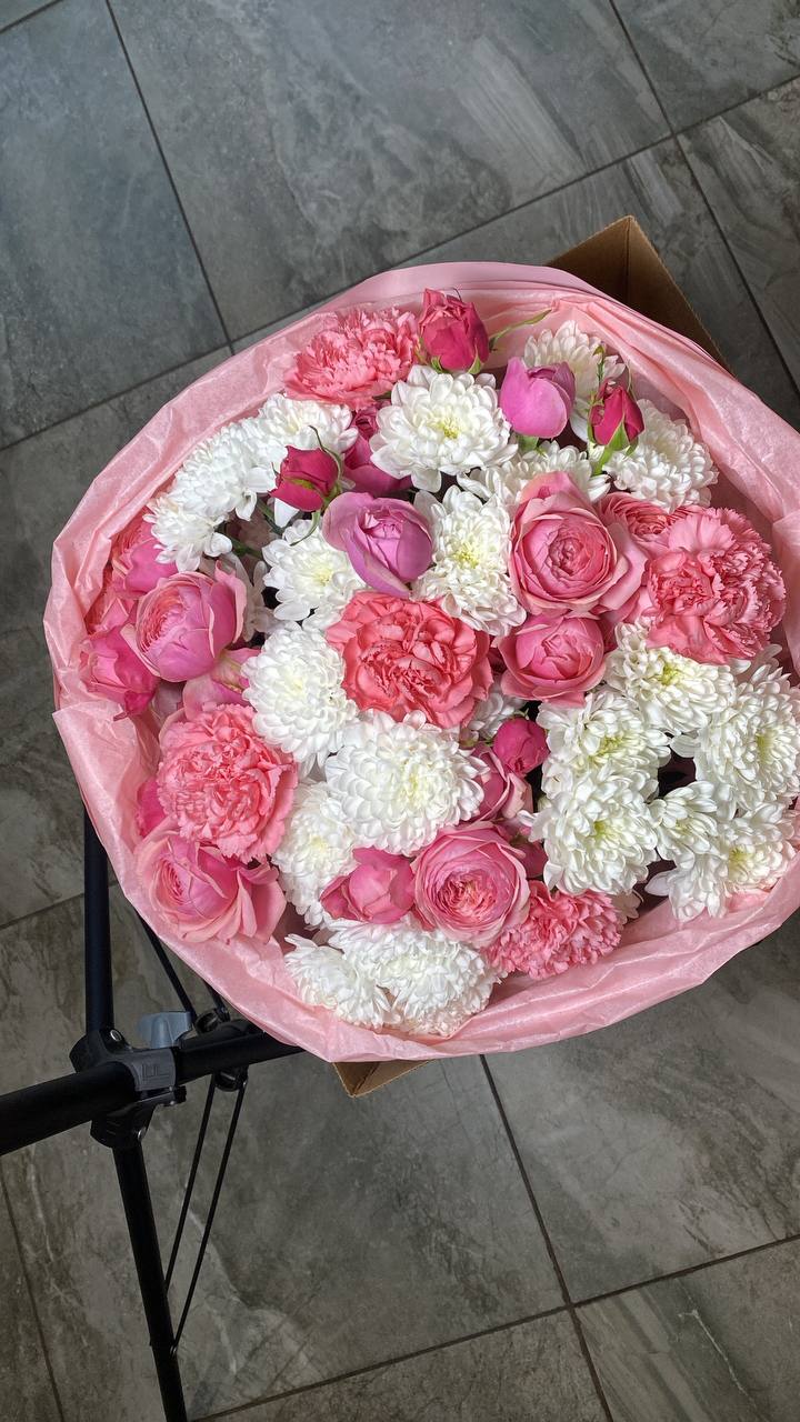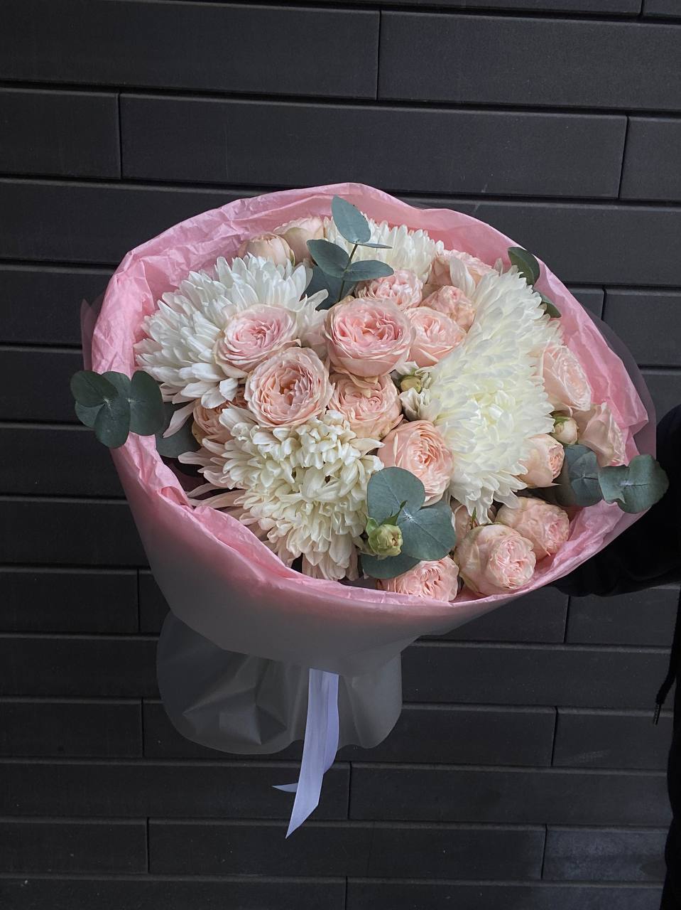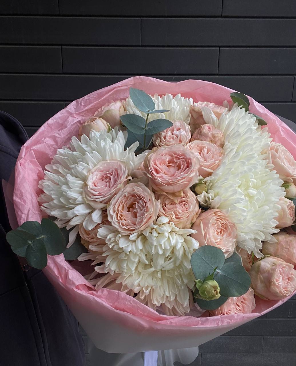 Розовые розы, хризантемы, упаковка в нежную розовую бумагу. Нежный и романтичный букет для любого повода!