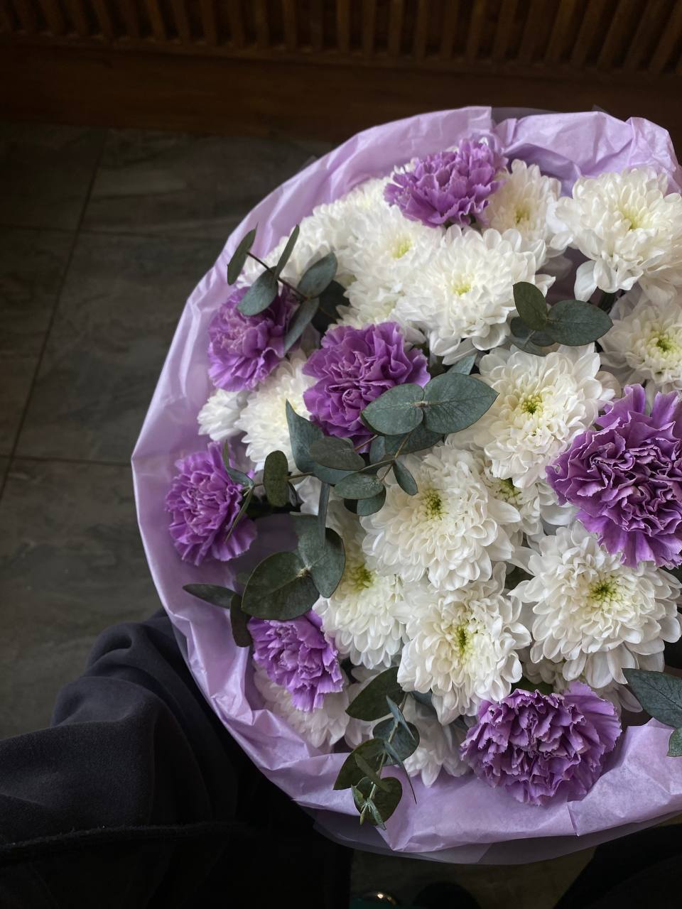 Бордовые розы, круглые хризантемы, розовые азалии, ирисы, папортник, перья, бумага!